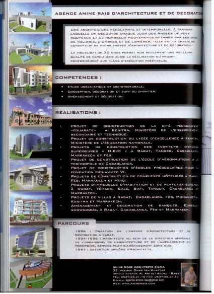 Du dessein au dessin, du rêve à la réalité, de la nature à l’art de bâtir, telle est la devise de l’Agence Amine Rais. Notre but est d’accompagner le maître d’ouvrage dans la réalisation de ses projets de la manière la plus efficace, la plus optimale et la plus harmonieuse ; et ce de l’étude de faisabilité à la réception définitive dans le respect des aspects environnementaux, culturels et techniques. Dotée d’une expérience de plus de vingt ans, notre équipe peut se charger de toutes les démarches : • Elaboration de programmes • Conception • Démarches administratives • Choix des entreprises • Suivi de la conformité des travaux • Obtention du permis d’habiter ou d’exploitation Notre principal parti, est l’art de fidéliser.